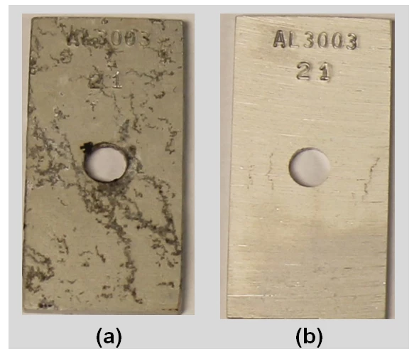 Dynalene also tested the compatibility of carbon steel, stainless steel and copper at 80°C for 250 hrs in Dynalene HC and CaCl2. The CaCl2 brine solution in contact with the steel and copper samples turned yellowish brown and bluish in color, respectively. It was observed that loose corrosion debris formed on the metal surfaces contaminated the Calcium Chloride coolant. The Dynalene HC fluid was completely clear after the immersion testing. The metal samples in contact with CaCl2 brine solution also showed discoloration, corrosion product build-up, but the samples were clean with no signs of corrosion in presence of the Dynalene HC
